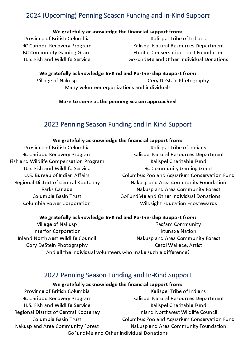 Thank you to our supporters and funders over the last 5 years to plan, construct and operate the Central Selkirk Caribou Maternity Pen.