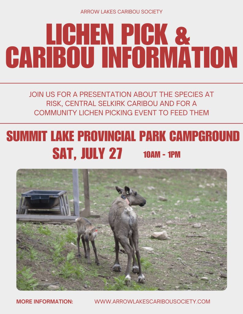 Join us for a lichen pick and presentation about the Central Selkirk Caribou herd on Saturday, July 27th at 10am at the Summit Lake Provincial Park Campground.