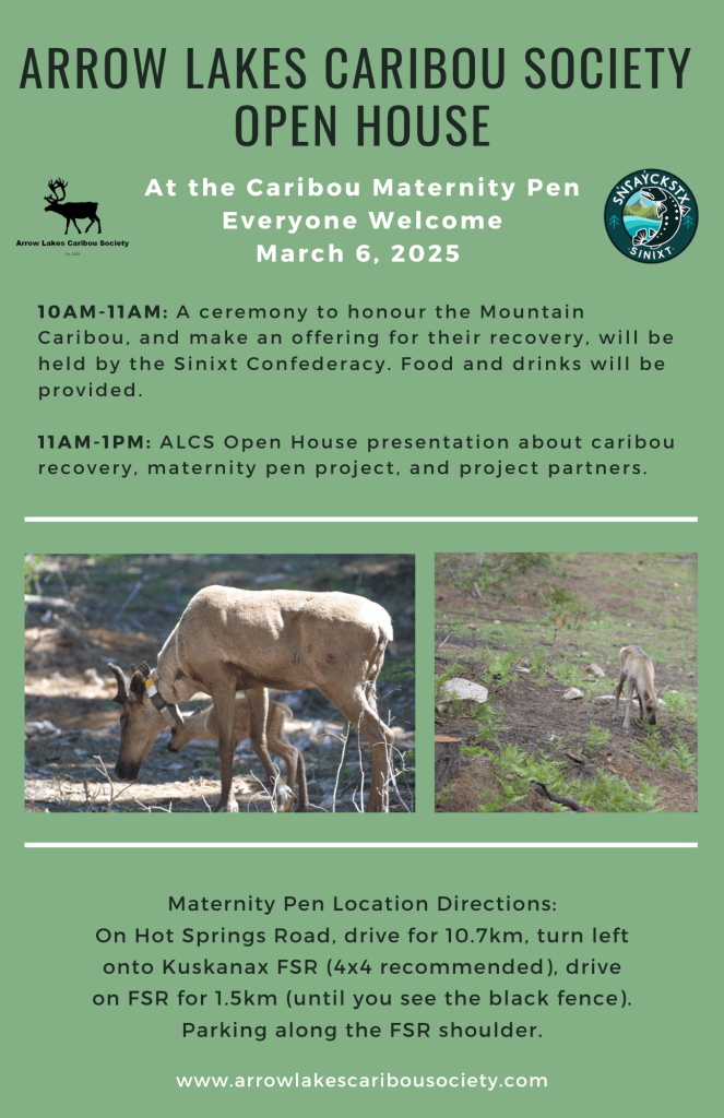 A ceremony to honour the Mountain Caribou, and make an offering for their recovery, will be held by the Sinixt Confederacy from 10:00-11:00 prior to the open house. Food and drinks will be provided.